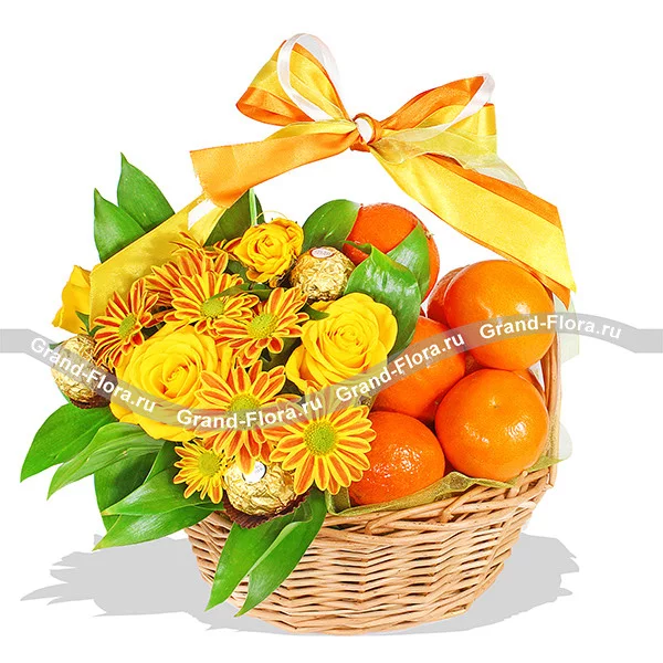 Стандартный (на фото): хризантема кустовая оранжевая - 2 шт, роза кустовая желтая - 1 шт., мандарины - 1 кг (возможна замена на апельсины), конфеты Ferrero Rocher, рускус, оазис - 0,5 кирпича, лента , корзинка.